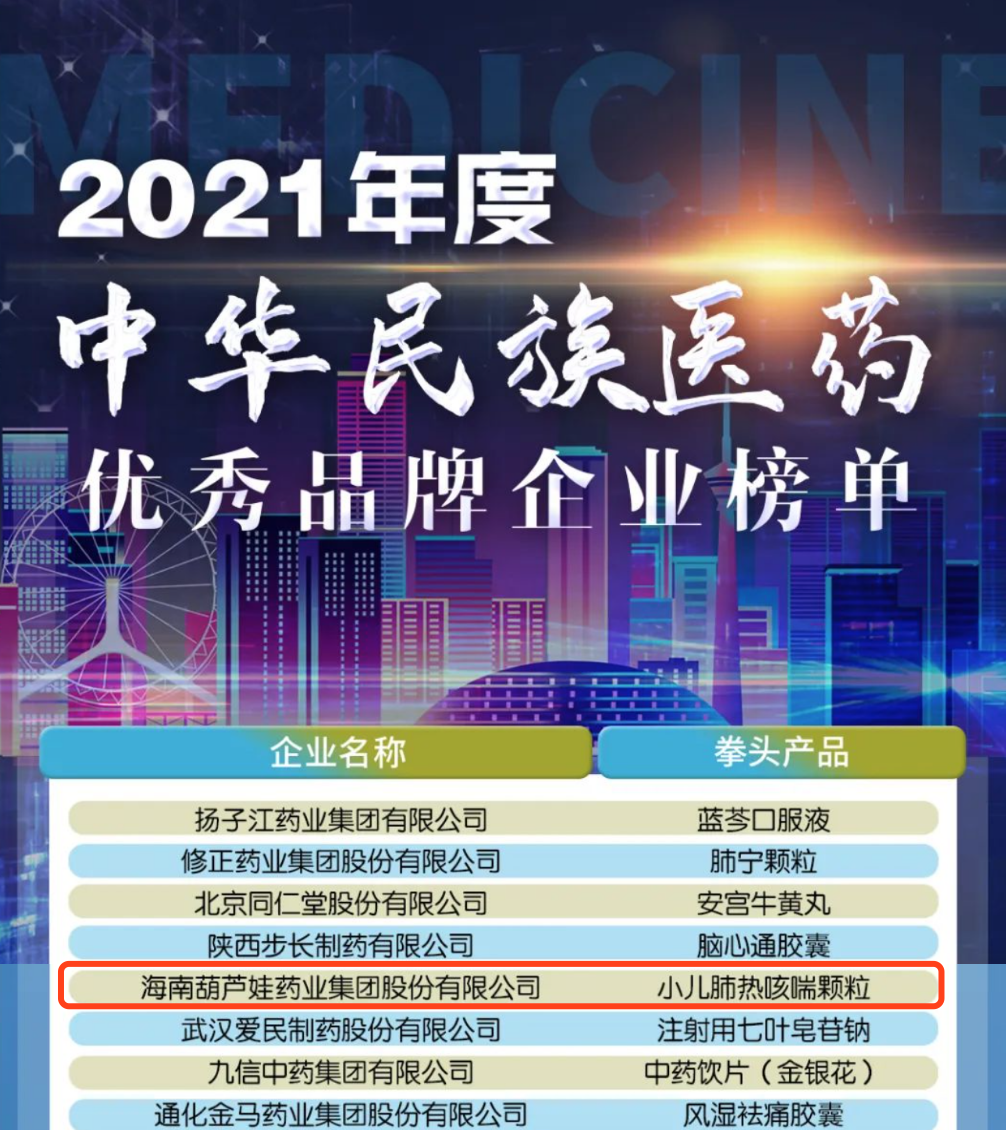 12月29日,全国工商联医药业商会发布了“2021年度中华民族医药优秀品牌企业榜单”,w66旗舰厅药业集团凭借黄金单品小儿肺热咳喘颗粒(4克)实力登榜。